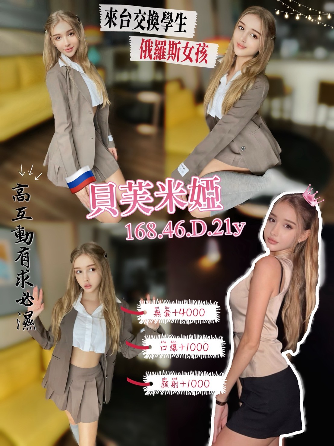 主打➡🇷🇺俄羅斯來台交換學生線上知名內衣小模,渾圓翹臀奔放性愛。態度滿分不打槍,究極美尻,真人芭比女神,難得的勻稱修長身材,回客不斷,熱銷紅牌。